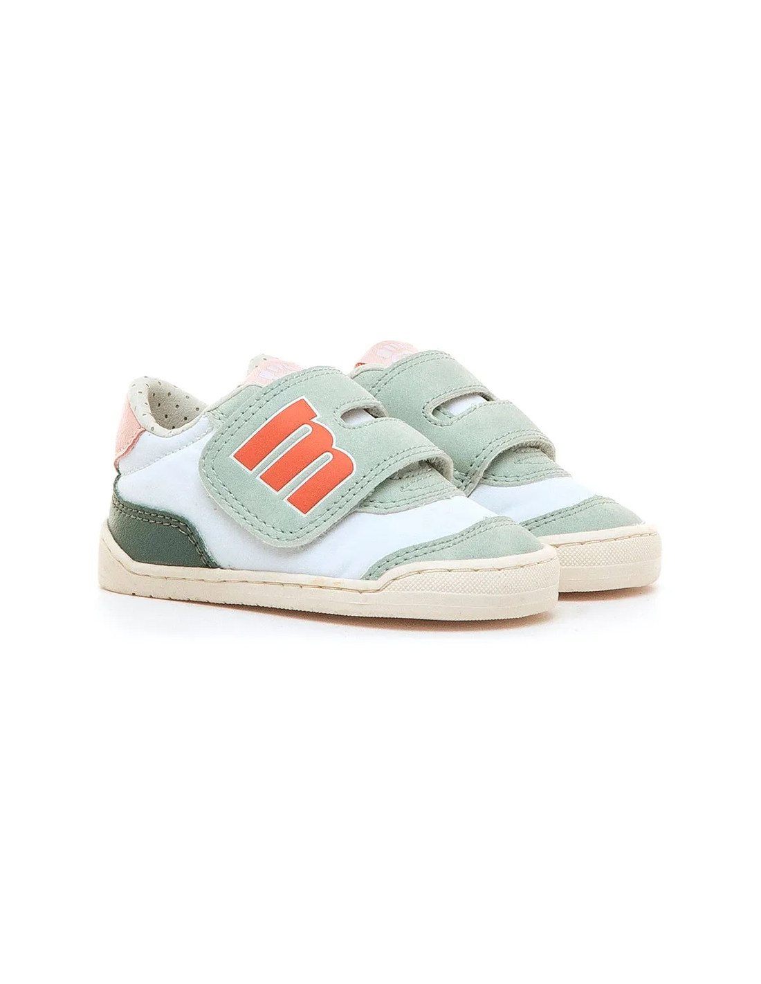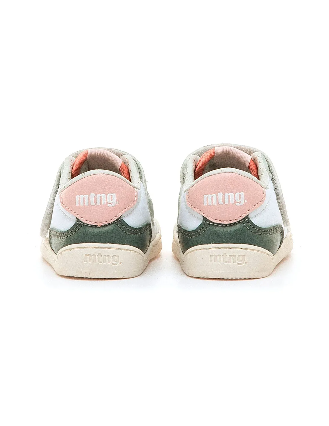 Zapatillas blancas para bebé de mtng, modelo Free Baby con detalles en verde.Presentan acentos en aqua y rosa claro, además de un logo en coral en la tira de velcro para un toque moderno.Desarrolladas en colaboración con el Dr. Juanjo López, traumatólogo pediátrico y deportivo, para respetar el desarrollo natural de los pies de los niños.Puntera ancha para un movimiento natural.Suela de 3 mm de grosor, zero drop, flexible y retorcible para evitar restringir el pie.Plantillas extraíbles que ayudan a comprobar el ajuste correcto.Fáciles de poner y quitar para un uso autónomo.Da los primeros pasos de tu bebé con mtng